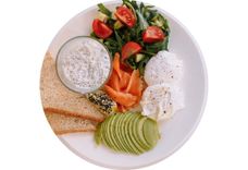 300 г • пашот (2 шт.), авокадо, чиа-йогурт, лосось, зелёный салат с томатами черри, огурцом и оливковым соусом, бриошь