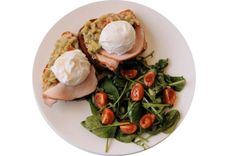 300 г • яйцо пашот (2 шт.), гуакамоле, бриошь, ветчина, зелёный салат с томатами черри, свежим огурцом и оливковым маслом