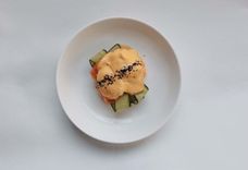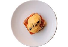 280 г • яйцо пашот (2 шт.), сыр творожный, соус голландский, хлеб бриошь, лосось, огурец свежий