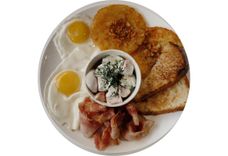 300 г • яичница из двух яиц, драники, битые огурцы, бекон, лук фри, томат, сметана, бриошь