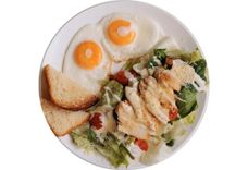 300 г • яичница из двух яиц, бриошь, филе цыплёнка, салат айсберг, томаты черри, огурец св., соус «Цезарь», сыр пармезан